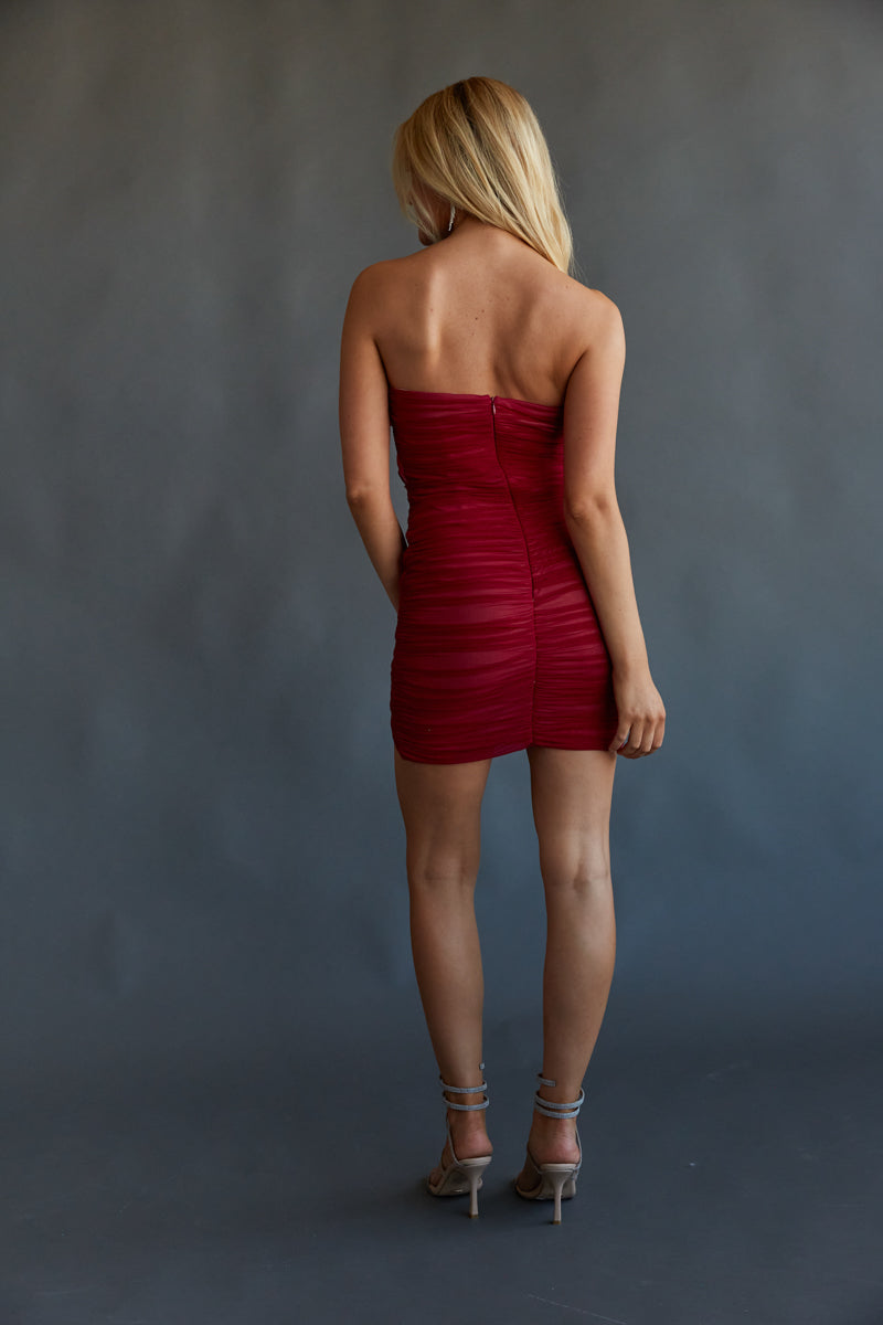All eyes will be on you in the Alexia Strapless Rosette Drape Bodycon Mini Dress! This stunning dress features a bodycon silhouette, straight across strapless neckline, rosette drape detail, and all over ruching. Finish off the look with your favorite !